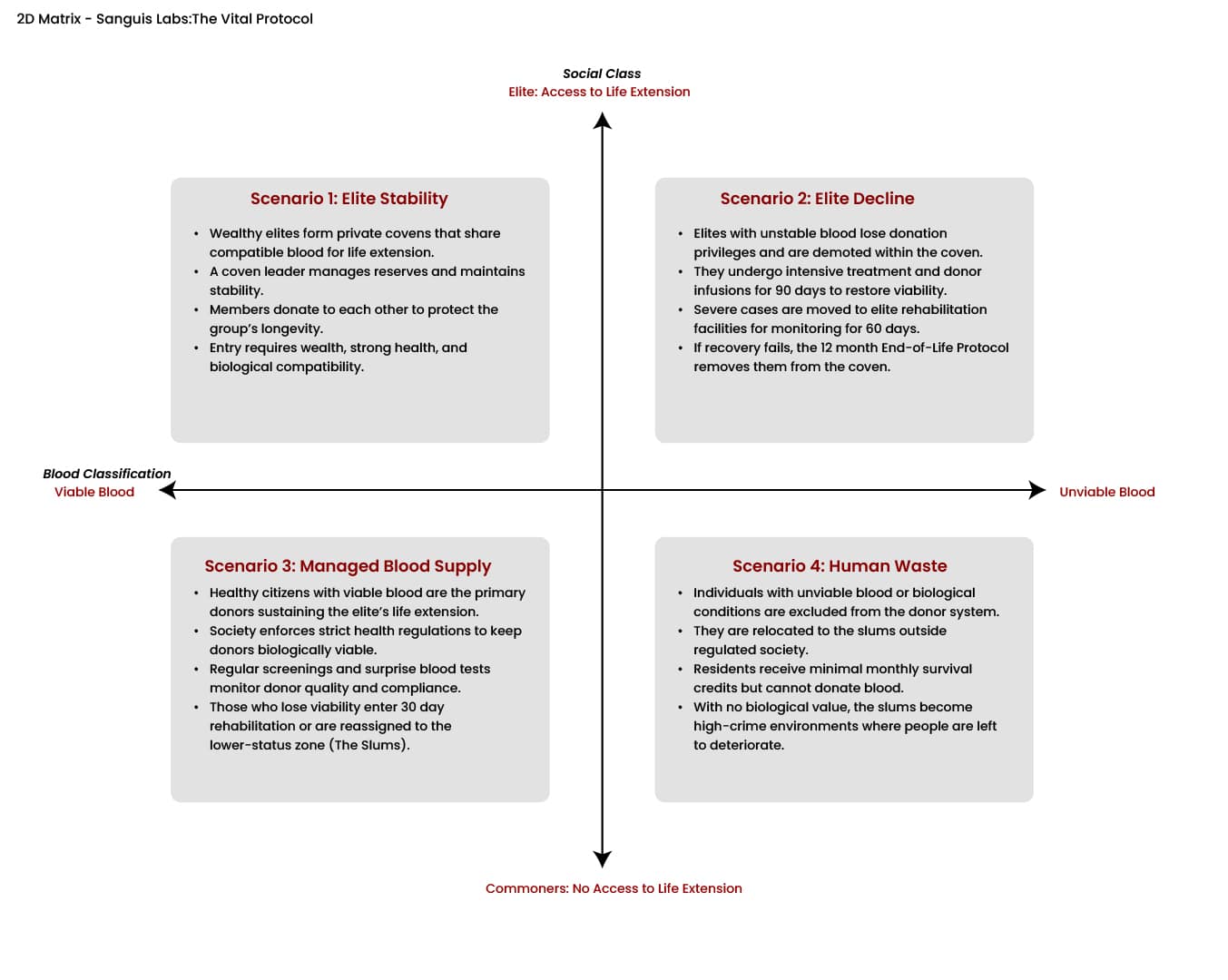 This matrix looks at how a society built around blood-based life extension might work. Vampires are used as the framework because they are usually imagined in the past or present, rarely in the future. If vampirism were real, it would likely appear not as myth but as a form of biotechnology controlled by those who could afford it. In that world, the wealthy could extend their lives and hold onto power across generations, while others keep the system running that sustains them. Rather than drinking blood to stay alive, these vampires drain the blood of others.