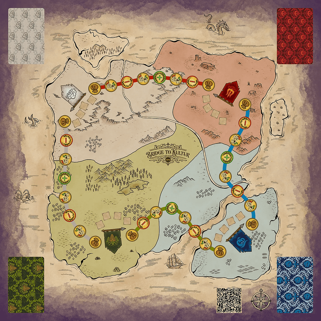 Bridge to Kultur is a hybrid board and digital game about trust, diplomacy, and survival. As Art Director, I created a manuscript-inspired visual identity and UI system that unified the board and app.