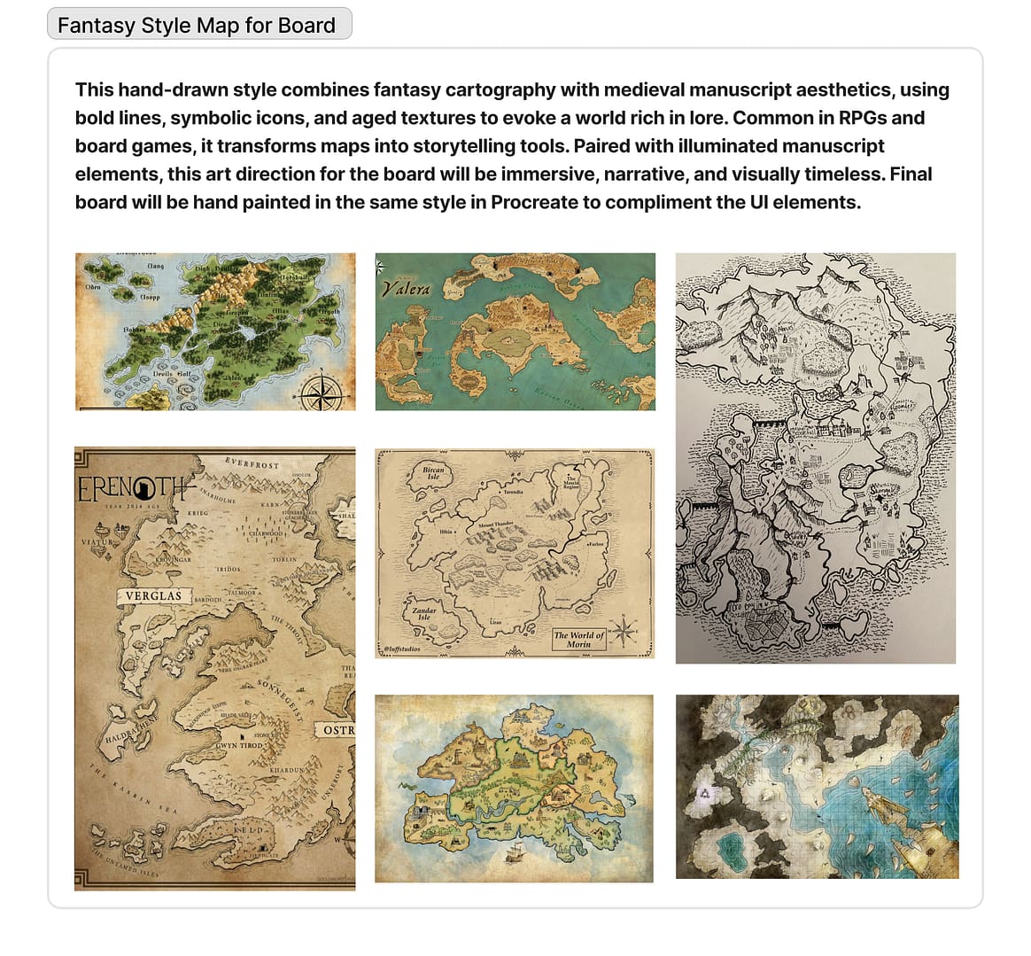 I created a mood board with fantasy map references to shape the board design direction, tying gameplay directly to worldbuilding.
