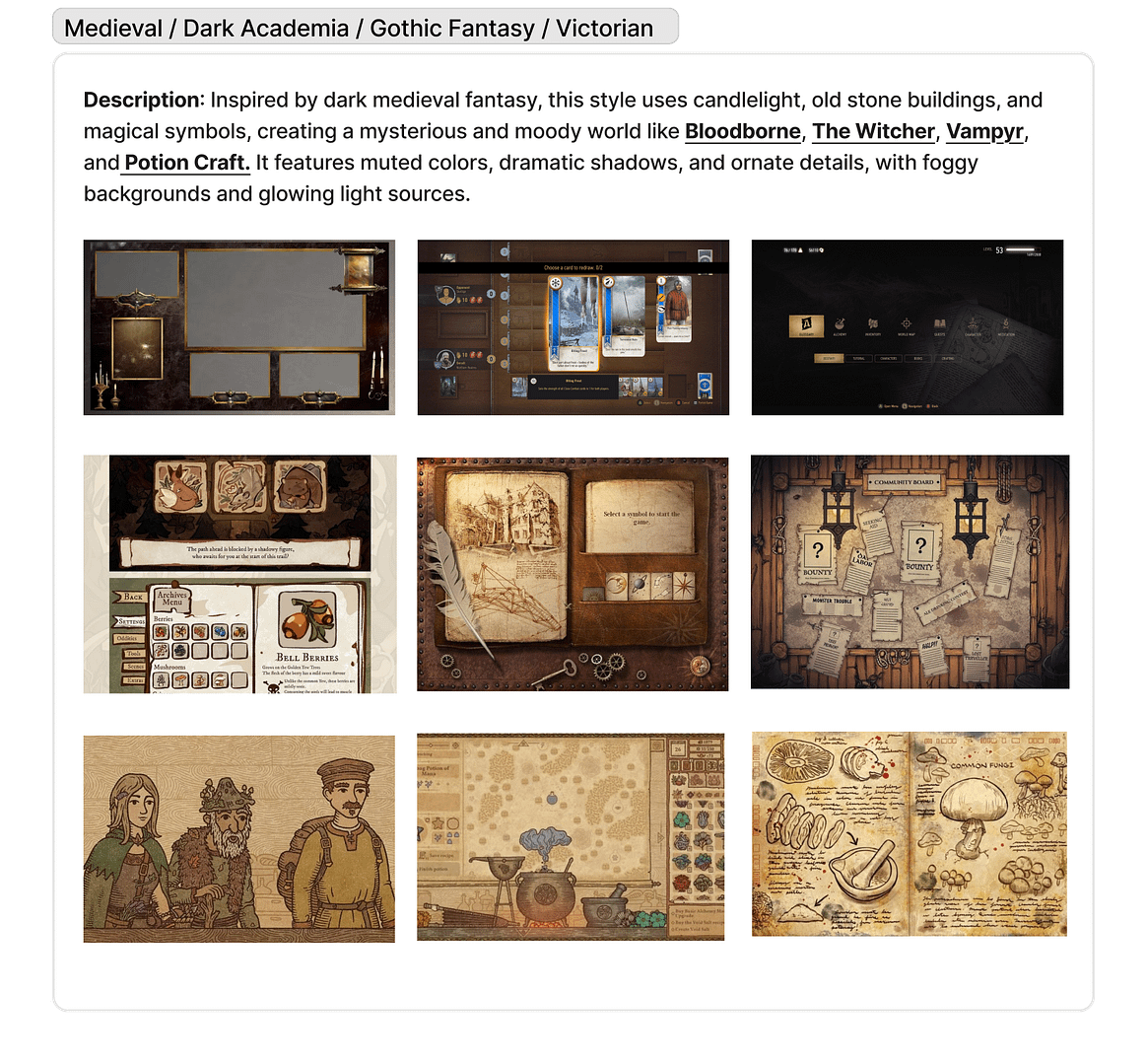 After reviewing the options, we chose the Medieval / Dark Academia style. Inspired by games like Bloodborne, The Witcher, Vampyr, and Potion Craft, this style uses candlelight, aged textures, and detailed illustration to create a serious, mysterious tone—ideal for a game about trust, negotiation, and survival. This process made sure the final art direction wasn’t just stylish, but thematically connected to the game’s world and mechanics.