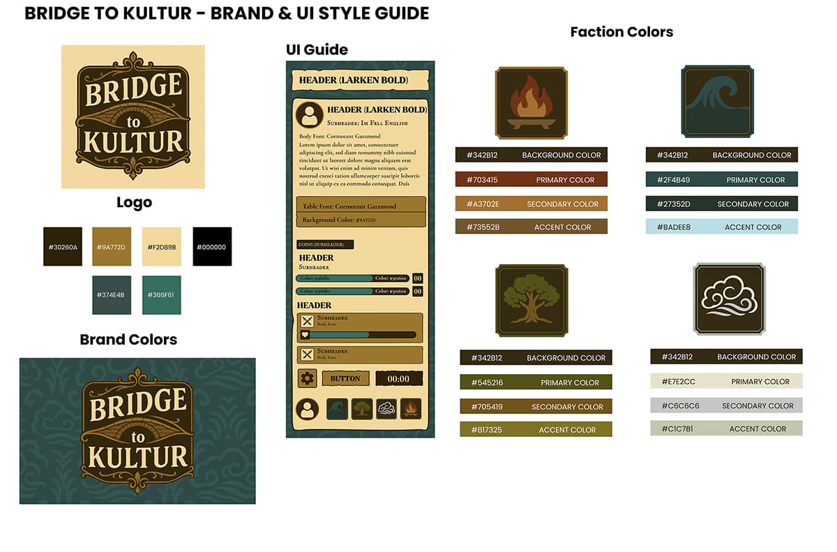 The original style guide established the game’s antique-inspired identity with ornate logos, aged textures, and a dark green palette. When applied to the UI, however, feedback revealed contrast issues that made text and buttons difficult to read. Using tools like WebAIM’s contrast checker, I refined the palette—lightening backgrounds, rebalancing colors, and adjusting text hierarchy to improve readability without losing the game’s tone.
