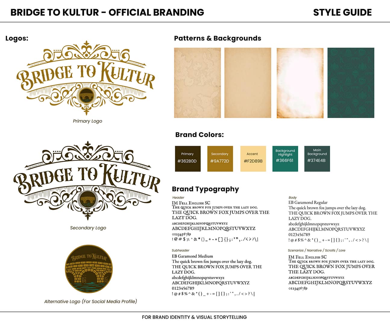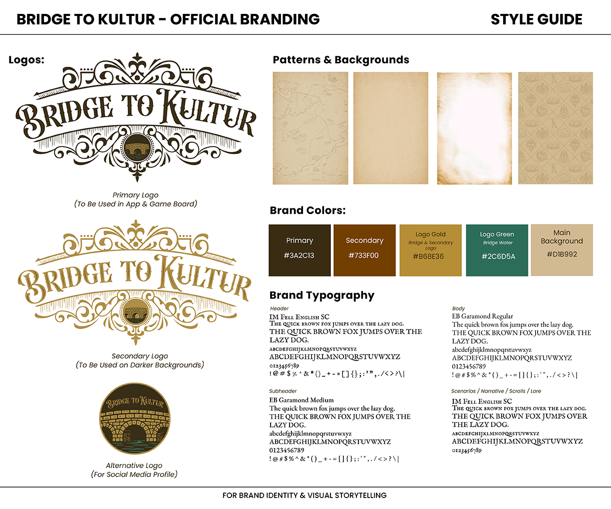 The final style guide unified visuals for both the board game and the app. A key change was replacing the dark green background, which was bold but clashed with parchment textures, with a cleaner palette. Green was retained as an accent in the logo to highlight the bridge graphic, making it usable as a standalone mark for app icons, UI, and social media. The guide defined updated colors, fonts, textures, and logo rules.