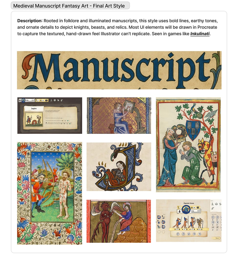 I created a medieval manuscript mood board to shape the art direction and guide UI, icons, and typography toward a textured, handmade feel.
