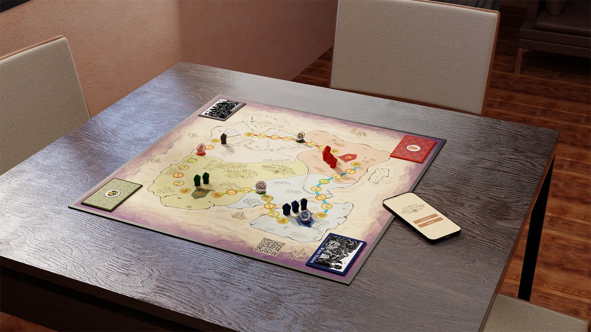 The completed design features a game board illustrated in the style of a fantasy map, paired with a mobile app for hybrid play.