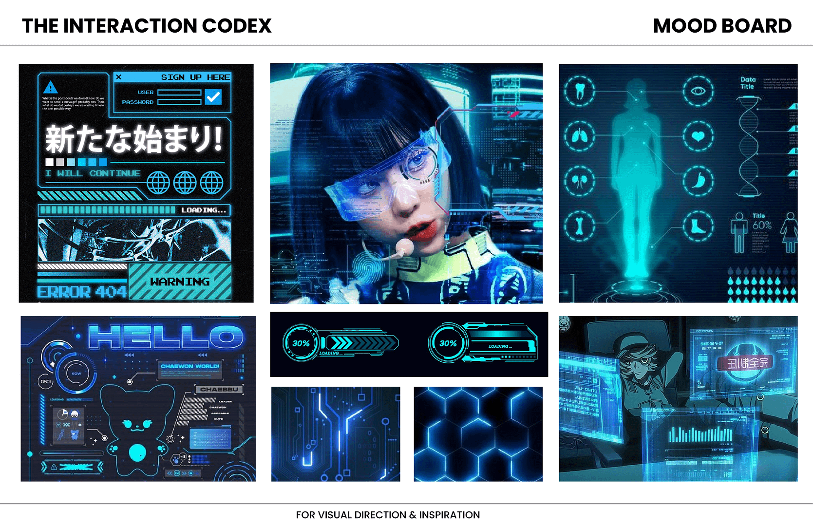 I began the art direction by creating a mood board with a strong cyberpunk influence and then referenced the Batman Arkham games as a key design reference. In those games, Batman’s HUD is central to his identity as a detective while also showcasing his advanced technology. The interface feels like a tool he truly uses, built into his process of investigation and problem solving rather than a neutral overlay. I adopted this approach as a design direction for The Interaction Codex, aiming to create an interface that feels purposeful, narrative-driven, and inseparable from the experience.